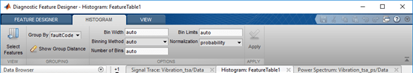 По умолчанию Diagnostic Feature Designer использует алгоритм автоматического объединения, который возвращает ячейки с равномерной шириной ячеек. Алгоритм выбирает настройки ячейки, чтобы охватить диапазон данных и показать основную форму распределения. Чтобы изменить алгоритм binning, выберите в меню Binning Method.
