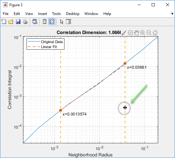 Визуально исследуйте значения радиуса с помощью команды «Исследовать». Исследование показывает график зависимости интеграла корреляции от радиуса. Интеграл корреляции - это средняя вероятность того, что состояния системы близки в два различных временных интервала. Этот интеграл отражает самоподобие. Можно изменить диапазон подобия, переместив одну из вертикальных ограничивающих линий, как показано на следующем рисунке. Цель состоит в том, чтобы связать линейную часть кривой. При закрытии фигуры ограничивающие значения автоматически переносятся в параметры размера «Корреляция».