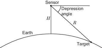 возвращает угол углубления от горизонтали на высоте depAng = depressionang(H,R)R метров до надводных целей. Датчик: H метров над поверхностью. R - дальность от датчика до надводных целей. Расчет предполагает криволинейную модель земли с эффективным радиусом земли, приблизительно в 4/3 раза превышающим действительный радиус земли.