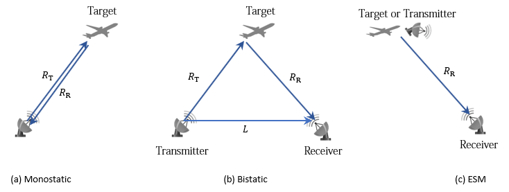 radarDataGenerator Объект системы может моделировать три режима обнаружения: моностатические, бистатические и электронные меры поддержки (ESM), как показано на следующих рисунках.