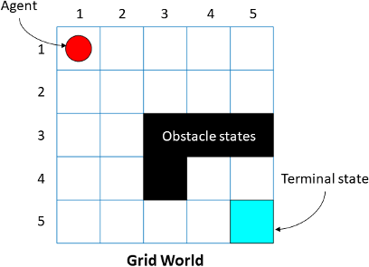 Черные ячейки являются состояниями препятствий, и их можно задать с помощью следующего синтаксиса: GW.ObstacleStates = ["[3,3]";"[3,4]";"[3,5]";"[4,3]"]; Пример рабочего процесса см. в разделе Подготовка агента обучения усилению в Basic Grid World. | ||||||