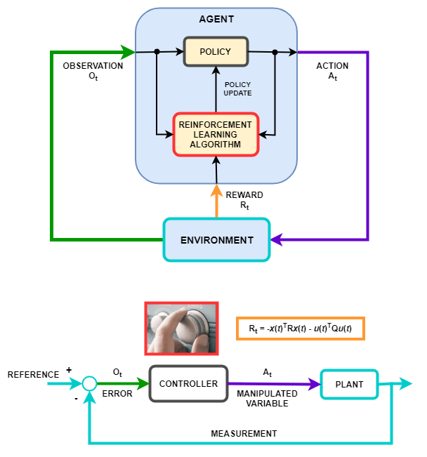 Поведение политики обучения усилению - то есть то, как политика наблюдает за окружающей средой и генерирует действия для выполнения задачи оптимальным образом - аналогично работе контроллера в системе управления. Обучение усилению можно перевести в представление системы управления, используя следующее сопоставление.