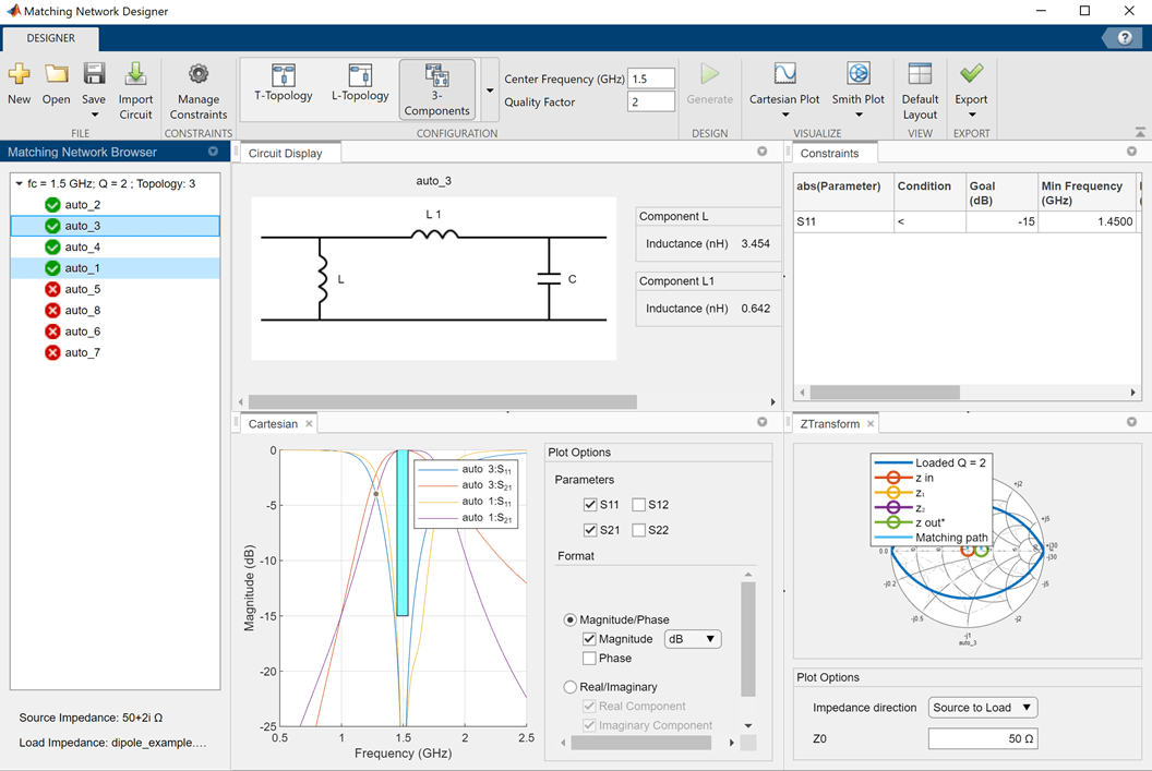 matchingNetworkDesignermatchingNetworkDesigner открывает приложение Matching Network Designer для проектирования, визуализации и сравнения однопортовых узкополосных сетей.