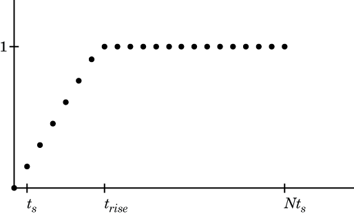 [outputsignal,tout] = stepresp(h,ts,n,trise) вычисляет отклик временной области объекта рациональной функции, hк сигналу шага, основанному на количестве выборок, n и время подъема, trise.