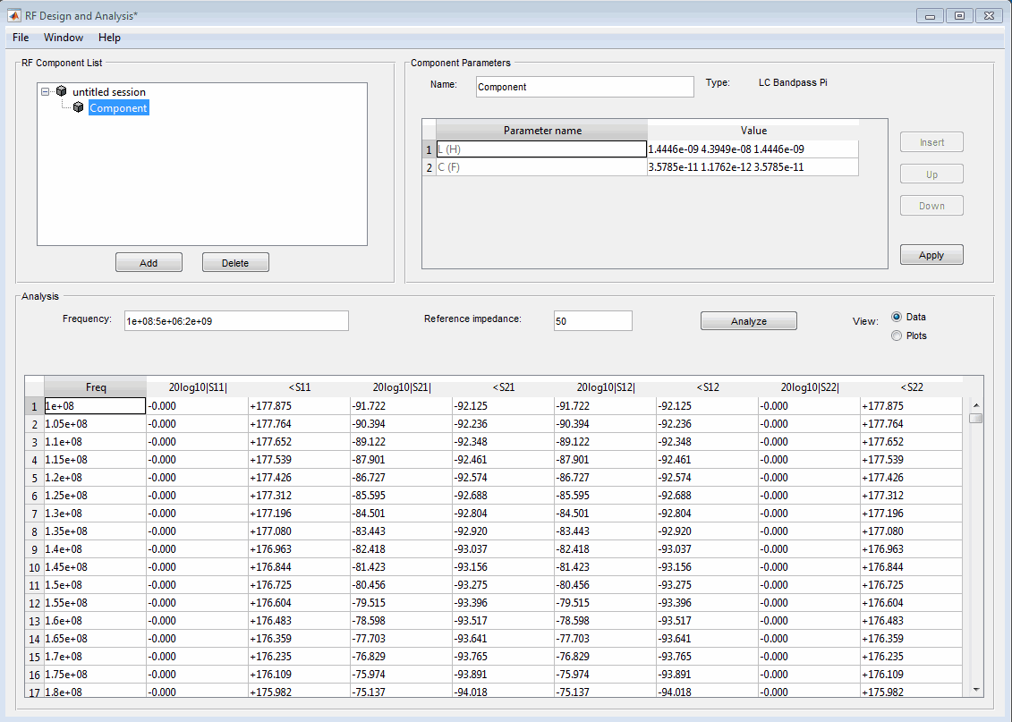 Щелкните Данные (Data) в правом верхнем углу панели Анализ (Analysis), чтобы просмотреть данные в табличной форме. На следующем рисунке показаны данные анализа для компонента LC Bandpass Pi на частотах и опорном импедансе, показанных на этапе 2.