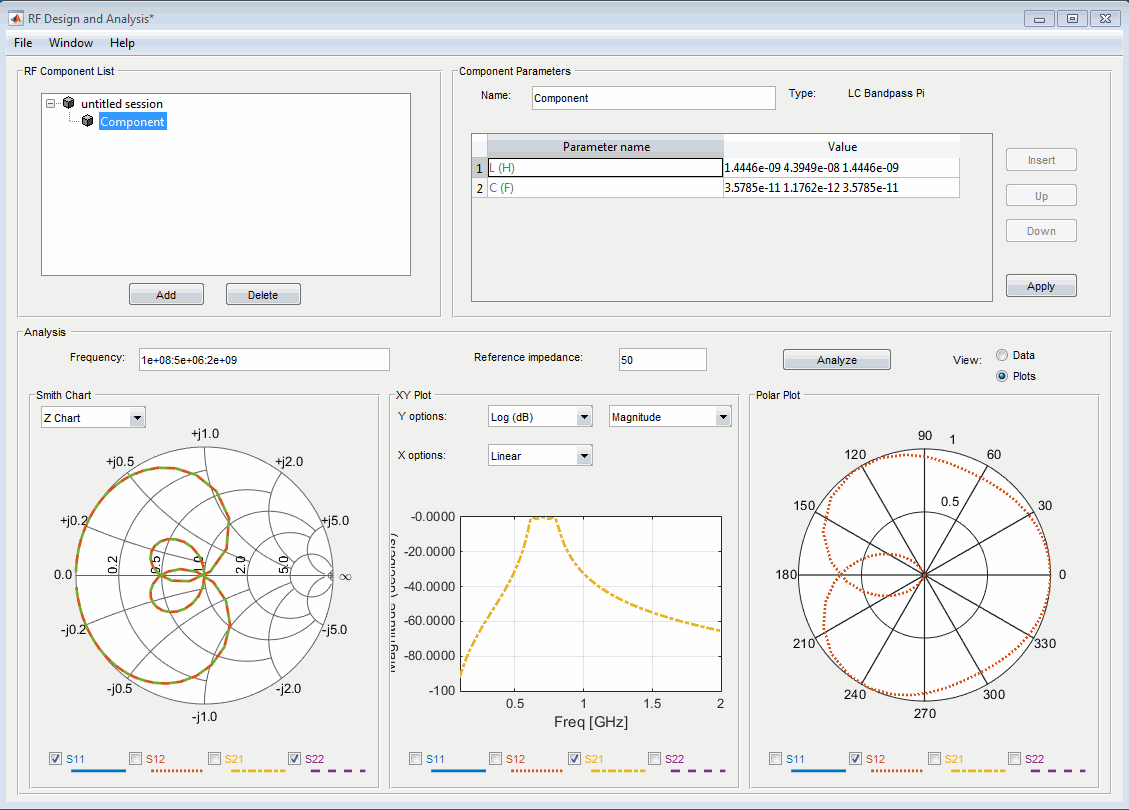 Выберите компонент или сеть, которые требуется проанализировать, на панели «Список компонентов RF» приложения RF Design and Analysis.