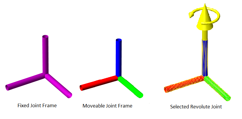 Рамки тела: отдельные рамки тела отображаются как 3-осевая координатная рамка. Фиксированные кадры являются розовыми кадрами. Типы подвижных соединений отображаются в виде осей RGB. Можно щелкнуть рамку тела, чтобы увидеть ось движения. Призматические соединения показывают желтую стрелку в направлении оси движения, а соединения вращения - круговую стрелку вокруг оси вращения.