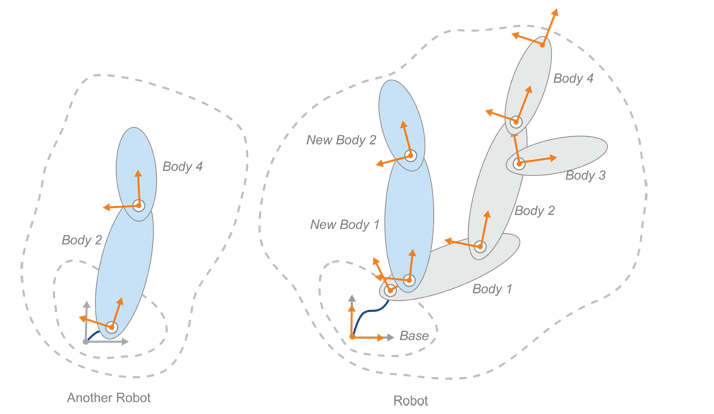 Можно создать поддерево из существующих роботов или других моделей роботов с помощью subtree. Укажите имя тела, которое будет использоваться в качестве основания для нового поддерева. Это поддерево можно изменить, добавив, изменив или удалив тела.