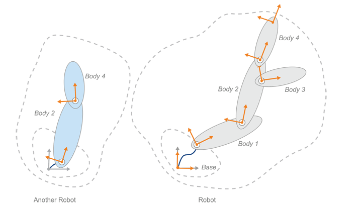 Можно также добавить эти поддеревы к роботу. Добавление поддерева аналогично добавлению тела. Указанное имя тела служит основой для присоединения, и все преобразования в поддереве относятся к этой рамке тела. Перед добавлением поддерева необходимо убедиться, что все имена тел и соединений уникальны. Создайте копии тел и соединений, переименуйте их и замените в поддереве. Звонить addSubtree для присоединения поддерева к указанному телу.