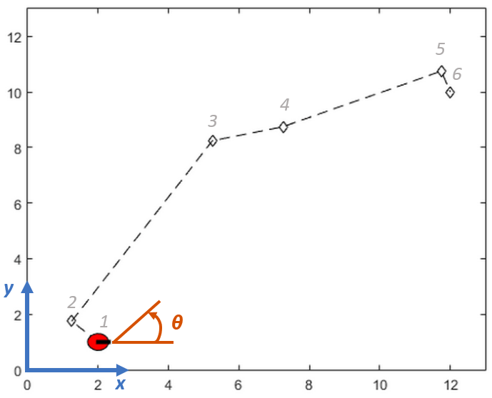 Важно понимать опорную координатную рамку, используемую алгоритмом чистого поиска для его входов и выходов. На рисунке ниже показана система координат привязки. Входные ППМ: [x y] координаты, которые используются для вычисления команд скорости робота. Поза робота вводится как поза и ориентация (тета) список точек как [x y theta]. Положительные направления x и y находятся соответственно в правом и верхнем направлениях (синим на рисунке). Значение тета - это угловая ориентация робота, измеренная против часовой стрелки в радианах от оси x (робот в настоящее время при 0 радианы).