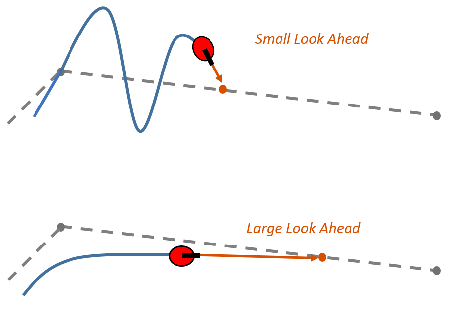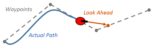 LookAheadDistance свойство должно быть настроено для вашего приложения и робота системы. Различные линейные и угловые скорости также влияют на эту реакцию и должны учитываться для тракта, следующего за контроллером.