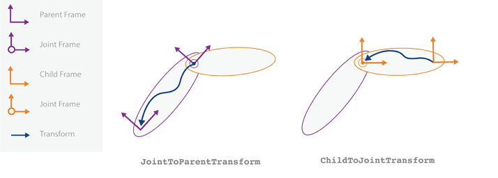 Соединения также имеют свойства, определяющие фиксированное преобразование между родительскими и дочерними координатными рамками тела. Эти свойства можно задать только с помощью setFixedTransform способ. В зависимости от метода ввода параметров преобразования: JointToParentTransform или ChildToJointTransform устанавливается с помощью этого метода. Другое свойство имеет значение единичной матрицы. На следующих рисунках показано, что означает каждое свойство.