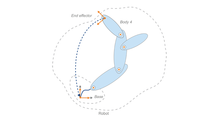 Дерево жёстких тел состоит из жёстких тел (rigidBody), которые крепятся через соединения (rigidBodyJoint). Каждое жесткое тело имеет соединение, которое определяет способ перемещения этого тела относительно его родительского элемента в дереве. Задайте преобразование от одного тела к другому, установив фиксированное преобразование для каждого соединения (setFixedTransform).