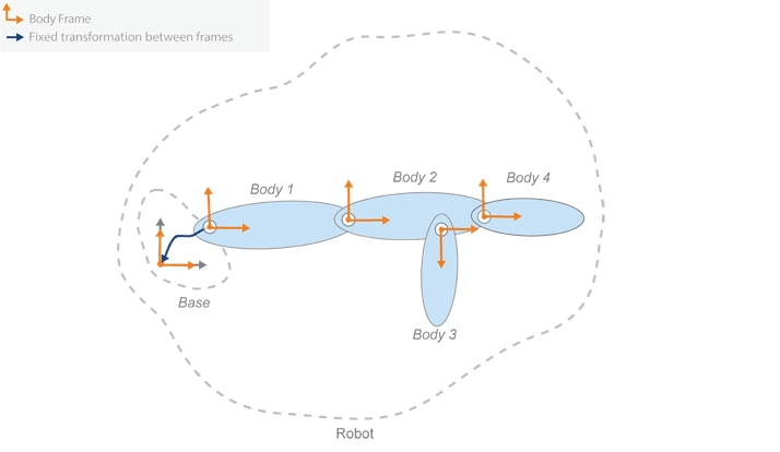 Каждое дерево жесткого тела имеет основание. Основание определяет мировую координатную рамку и является первой точкой присоединения для жесткого тела. База не может быть изменена, за исключением Name собственность. Это можно сделать, изменив BaseName свойства дерева жесткого тела.