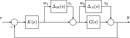 где TI (s) обозначает входную дополняющую функцию чувствительности, а SO (s) обозначает выходную функцию чувствительности. Ограничения на размер матриц передаточной функции от z1 до w1 и от z2 до w2 обеспечивают устойчивость системы с замкнутым контуром к мультипликативной неопределенности ΔM (s) на входе установки и аддитивной неопределенности ΔA (s) вокруг установки G (s). В формулировке проблемы управления H∞ цели надежности входят в процедуру синтеза в качестве дополнительных входных/выходных сигналов, которые должны оставаться малыми. Соединение с удаленными блоками неопределенности следует ниже.