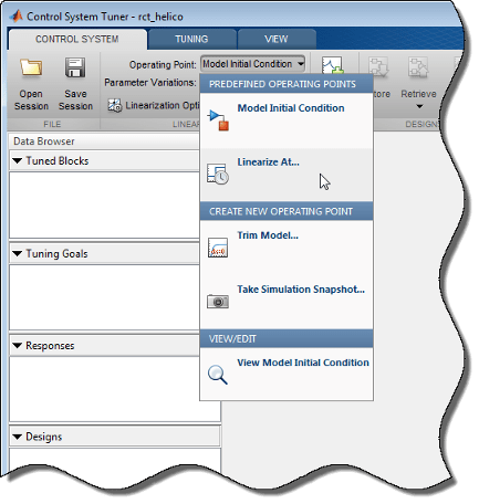 Тюнер системы управления может настраивать параметры контроллера для линеаризации модели Simulink, полученной в любое время снимка моделирования или в установившейся рабочей точке. На вкладке «Система управления» используйте меню «Операционная точка» для вычисления и выбора рабочих точек для линеаризации и настройки.