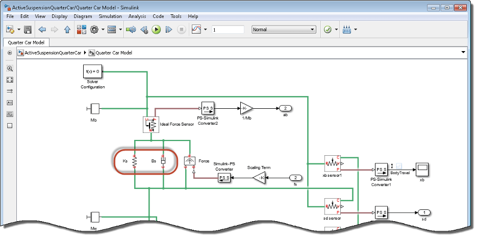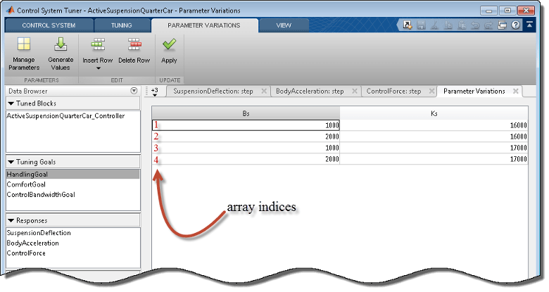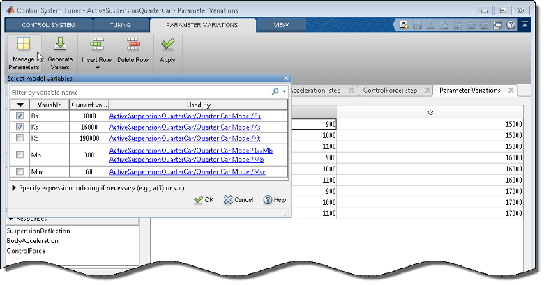 Можно изменять любой параметр блока, значение которого хранится в качестве переменной в рабочей области модели или в рабочей области MATLAB. Однако не изменяйте параметры блока контроллера, назначенные для настройки (см. раздел Задание блоков для настройки в настройщике системы управления). Скорее, варьируйте параметры, определяющие атрибуты завода в системе управления. Например, в модели ActiveSuspensionQuarterCar, параметры блока, указанные как переменные, включают в себя пружинную константу, Ksи постоянной демпфирования, Bs.