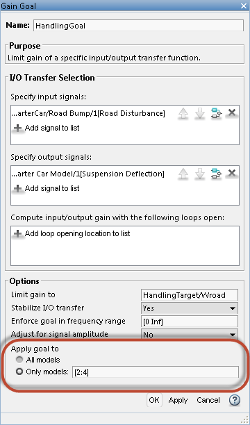 Иногда требуется ограничить применение целей настройки подмножеством моделей, для которых выполняется одновременная настройка. Например, предположим, что линеаризация модели выполняется в четыре раза, t = [0,5,10,20]. Вы хотите настроить модель так, чтобы она соответствовала вашим целям конструирования в это время. Однако предположим далее, что у вас есть одна цель настройки, которую вы не хотите применять в t = 0 потому что он должен применяться только после перехода модели в устойчивое состояние. Чтобы ограничить применение этой цели настройки: