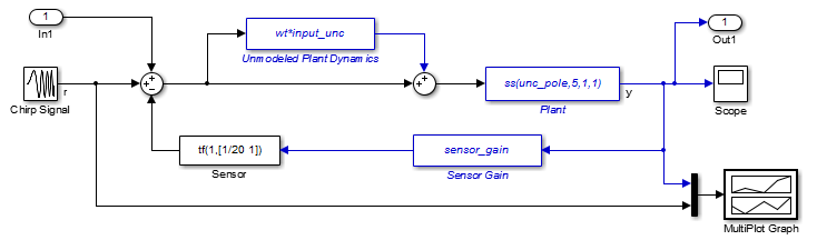 Модель, как показано на следующем рисунке, содержит три блока пространства неопределенного состояния, названные немоделируемой динамикой установки, установкой и коэффициентом усиления датчика. Эти блоки зависят от трех неопределенных переменных input_unc, unc_pole и sensor_gain.