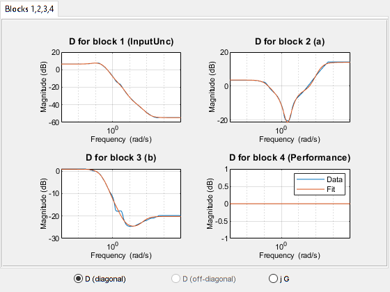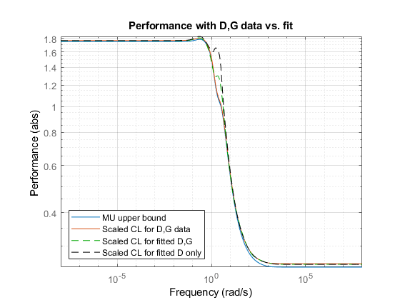 Создает графики, которые позволяют визуализировать посадки D и G, устойчивую производительность перед подгонкой и масштабируемую производительность H∞ после подгонки. Изучение этих графиков может помочь определить, достаточно ли высок максимальный порядок подгонки, чтобы зафиксировать все частотно-зависимые вариации в шкалах (см. FitOrder вариант musynOptions для получения дополнительной информации.