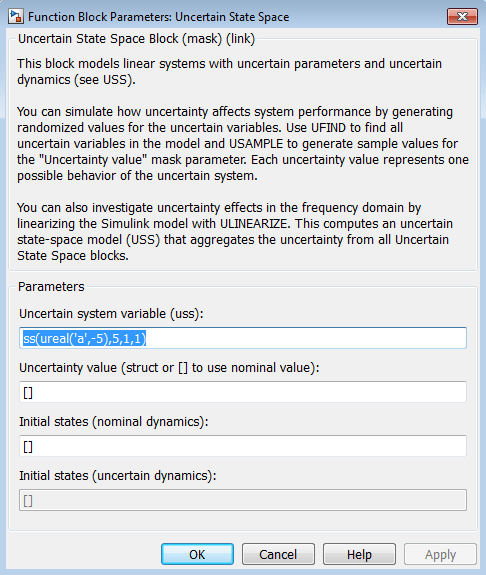 Укажите неопределенную модель состояния-пространства в поле Неопределенная системная переменная (uss). Модель должна быть uss объект или любая другая модель, которая может быть преобразована в uss, такие как umat, ureal, umargin, и ultidyn. Модель зависит от набора неопределенных переменных (ureal, umargin, или ultidyn) и можно указать модель одним из следующих способов: