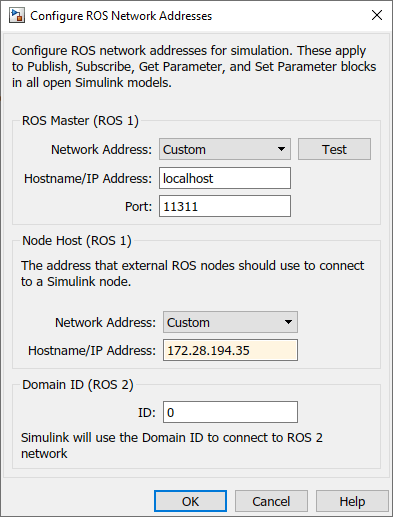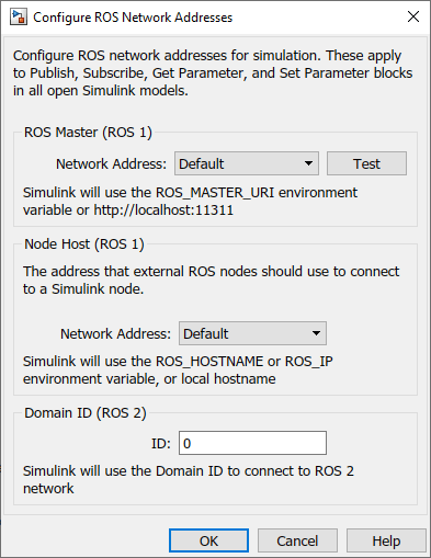 Во время инициализации модели Simulink подключается к хозяину ROS, а также создает узел, связанный с моделью. Главный URI ROS и хост узла указаны в диалоговом окне «Configure ROS Network Addresses». Доступ к нему можно получить на вкладке Моделирование, выбрав пункт Панель инструментов ROS > Сеть ROS.