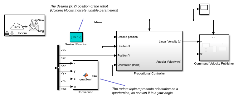 Просмотрите пример управления обратной связью робота с поддержкой ROS, в котором подробно описывается модель Simulink, из которой создается код.