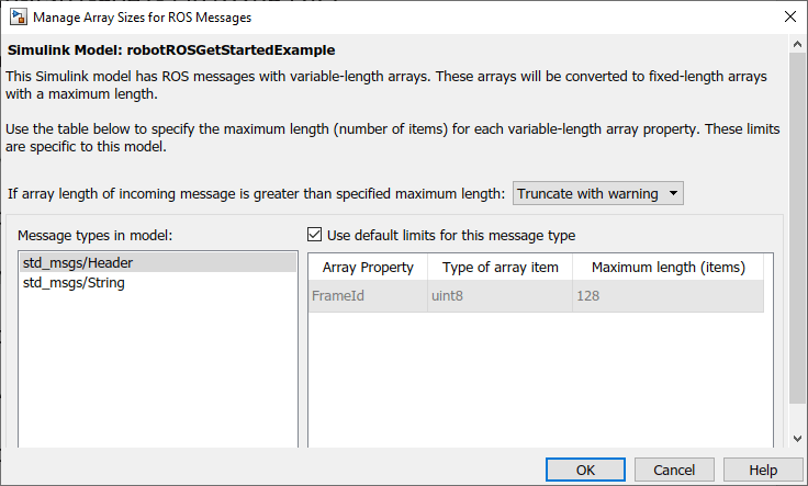 Поскольку свойства сообщения имеют переменную длину, их можно усечь, если они превышают максимальный размер, установленный для этого массива. У вас есть возможность Truncate with warning или Truncate silently. В любом случае моделирование будет запущено, но Truncate with warning отображает предупреждение в средстве просмотра диагностики о том, что свойство сообщения было усечено. При использовании сгенерированного кода предупреждение будет выдаваться с помощью операторов журнала в ROS. Предупреждение будет ROS_WARN_NAMED оператор log и имя является именем модели.