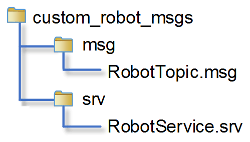msg содержит все пользовательские определения типов сообщений. Вы также должны добавить все пользовательские определения типов услуг в srv папка. Например, пакет custom_robot_msgs имеет эту папку и структуру файлов.