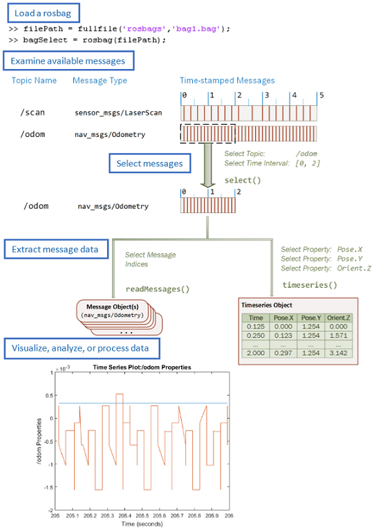 Rosbag или bag - формат файла в ROS для хранения данных сообщения ROS. Эти пакеты часто создаются путем подписки на один или более разделов ROS и сохранения принятых данных сообщения в эффективной файловой структуре. MATLAB ® может считывать эти файлы rosbag и помогать с фильтрацией и извлечением данных сообщений. В следующих разделах подробно описывается структура rosbags в MATLAB ® и поток операций для извлечения данных из них.