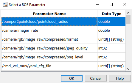 Это список параметров, которые можно выбрать на сервере параметров ROS. Параметры, выделенные серым цветом, имеют неподдерживаемые типы данных. Выберите имя параметра, которое не отображается серым цветом, и нажмите кнопку «ОК». Это должно привести к автоматическому заполнению параметров блока типами «Имя» и «Данные».