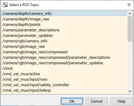 В этом диалоговом окне отображается список тем, доступных в шаблоне ROS. Выбор темы из списка автоматически заполняет параметры «Тема» и «Тип сообщения» для соответствующего диалогового окна маски блока. Если тип сообщения не поддерживается в MATLAB ® ROS, Simulink выдаст ошибку. После выбора раздела он сохраняется вместе с блоком. Даже если раздел больше не доступен в сети, блок будет использовать это имя раздела.