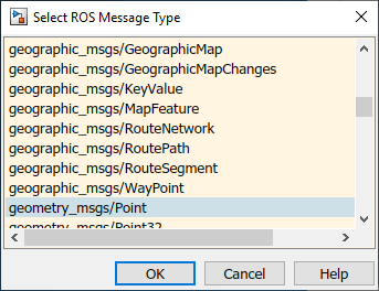 Simulink ROS позволяет выбирать из списка типы сообщений, в настоящее время поддерживаемые MATLAB ROS, при установке типа сообщения для блоков Публикация, Подписка или Пустое сообщение.