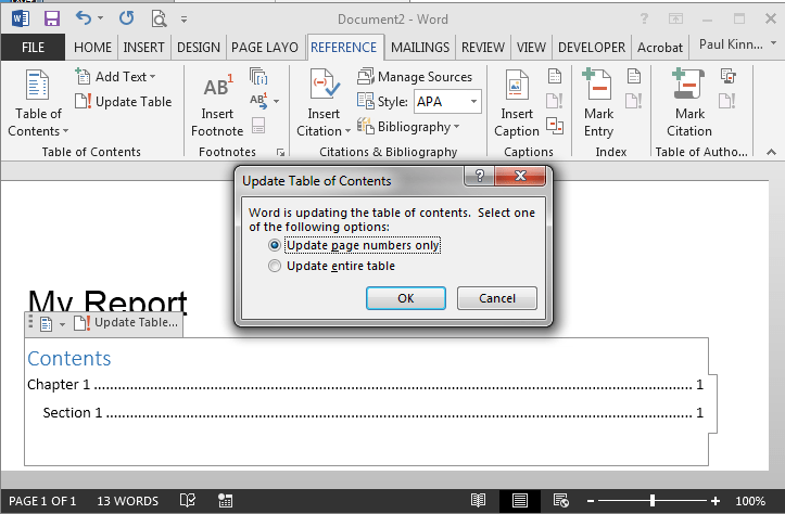 В диалоговом окне Обновить оглавление выберите Обновить всю таблицу и нажмите кнопку ОК.
