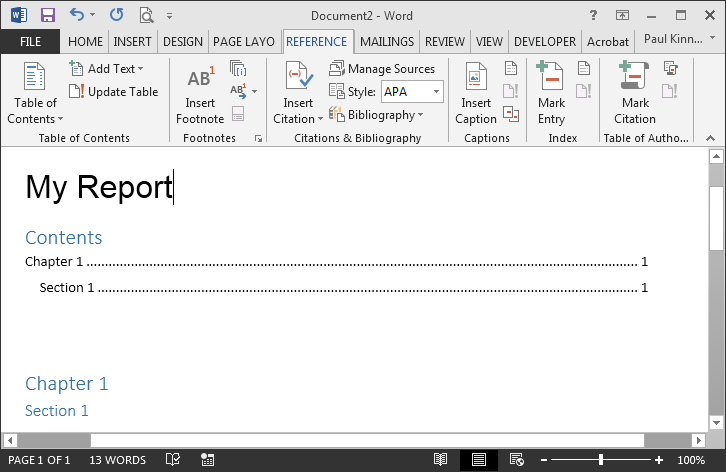 import mlreportgen.dom.*; d = Document('MyReport','docx','MyTemplate'); append(d,Paragraph('Chapter 1','Heading 1')); append(d,Paragraph('Section 1','Heading 2')); close(d); rptview(d.OutputPath); % Updates the TOC