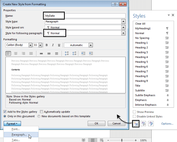 Примените стиль MyDate к абзацу, содержащему отверстие Date.