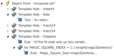 % This M-code sets up two variables % that define how the report runs. % mgicSizeVector is a list of MxM % Magic Square sizes to insert into % the report. Magic squares cannot % be 2x2. magicSizeVector=[4 8 16 32]; % largestDisplayedArray sets the % limit of array size to insert % in the report with the % Insert Variable component. largestDisplayedArray=15;