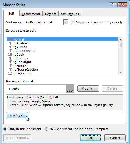 В диалоговом окне нажмите «Открыть таблицу стилей». Откроется диалоговое окно Управление стилями Microsoft ® Word.