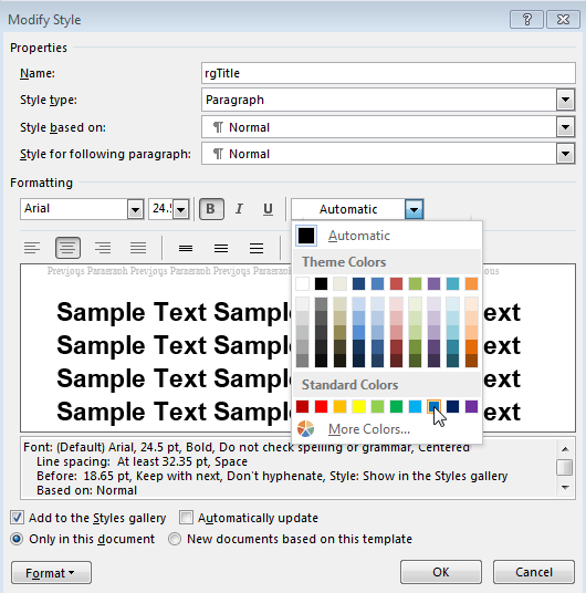 В диалоговом окне «Изменение стиля» для rgTitle, щелкните стрелку вниз для Automatic. Выберите синий цвет и нажмите кнопку ОК.