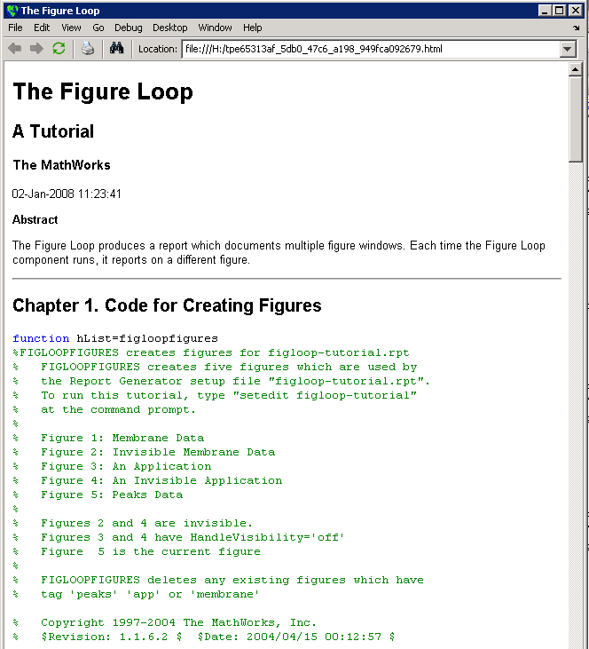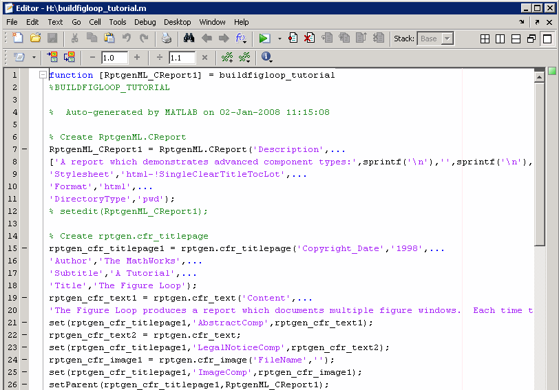 Программное обеспечение генератора отчетов MATLAB генерирует код MATLAB для figloop_tutorial.rpt файл настройки отчета. Он сохраняет этот код в buildfigloop_tutorial.m в указанной папке. Часть этого файла отображается на следующем рисунке.