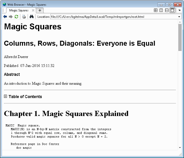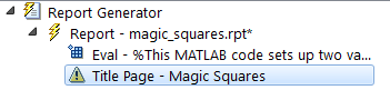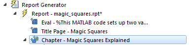 В этом примере показано, как с помощью проводника отчетов был создан базовый отчет. Этот отчет объясняет и иллюстрирует магические квадраты - матрицы, столбцы, строки и диагонали которых складываются в одно и то же число (см. magic ссылка на функцию в документации MATLAB ®).
