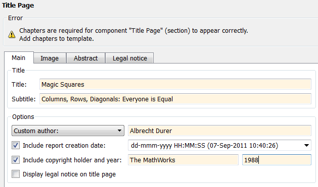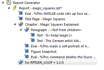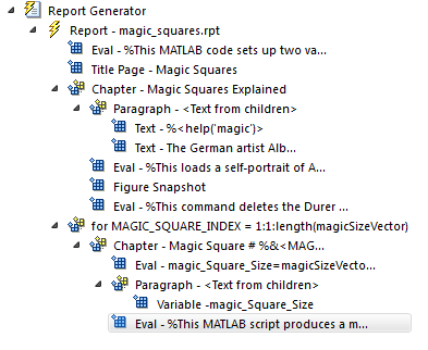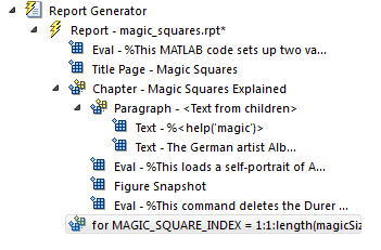 %This MATLAB code sets up two variables %that define how the report runs. %magicSizeVector is a list of MxM %Magic Square sizes to insert into %the report. Note that magic %squares cannot be 2x2. magicSizeVector=[4 8 16 32]; %largestDisplayedArray sets the %limit of array size that will be %inserted into the report with the %Insert Variable component. largestDisplayedArray=15;