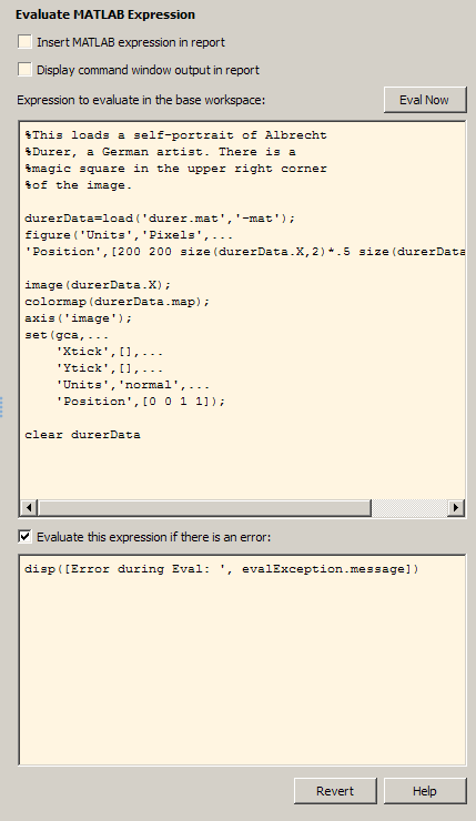 disp(['Error during eval: ', evalException.message])Этот код выполняется при возникновении ошибки при создании и отображении магического квадрата.