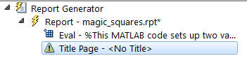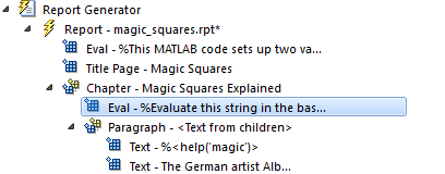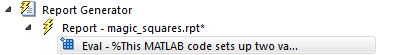 В отчет можно добавить код MATLAB с помощью компонента Вычислить выражение MATLAB (также называемого Eval компонент).
