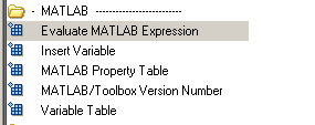 В средней части панели Библиотека (Library) в категории MATLAB добавьте в настройку отчета компонент Вычислить выражение MATLAB (Evaluate MATLAB Expression).