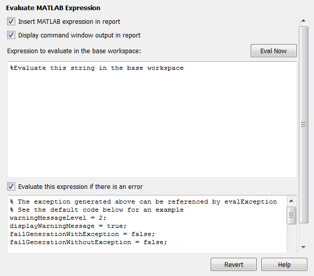 Диалоговое окно Вычислить выражение MATLAB (Evaluate MATLAB Expression) содержит флажок Вычислить это выражение (Evaluate this expression) при наличии ошибки. Диалоговое окно содержит код обработки ошибок по умолчанию, который можно использовать, или можно создать собственный код обработки ошибок.