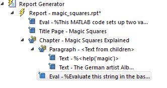 На панели «Структура» нажмите Eval компонент появляется под magic_squares отчет.