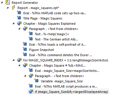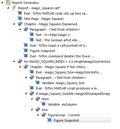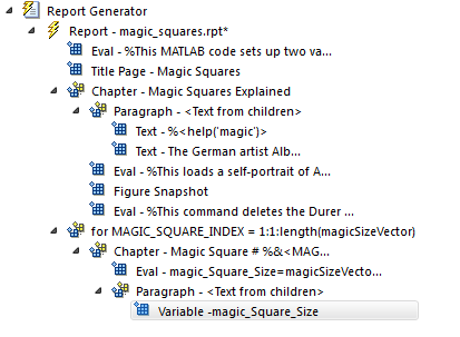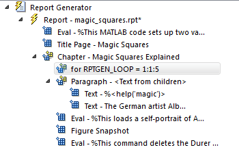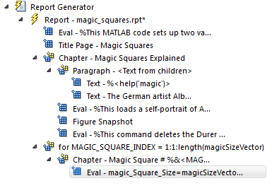 Добавьте главу в отчет для каждого магического квадрата, указанного переменной отчета magicStartVector. Вы используете For Loop для выполнения этой повторяющейся задачи. Для создания магических квадратов и их изображений необходимо выполнить следующие задачи: