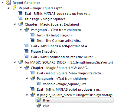 Чтобы обработать результат этого компонента Logical If, создайте два дочерних компонента - Logical Then и Logical Else. Еслиmagic_Square_Size меньше или равно 15, переменная матрицы отображается в отчете. Если magic_Square_Size больше 15, матричное изображение появляется в отчете.