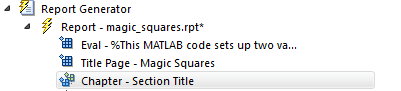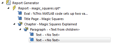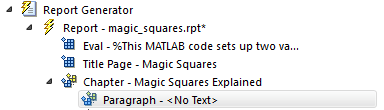 Чтобы настроить отчет о магических квадратах, сначала создайте файл настройки для хранения настройки. Затем добавьте в настройку объекты MATLAB, называемые компонентами, чтобы указать содержимое отчета.